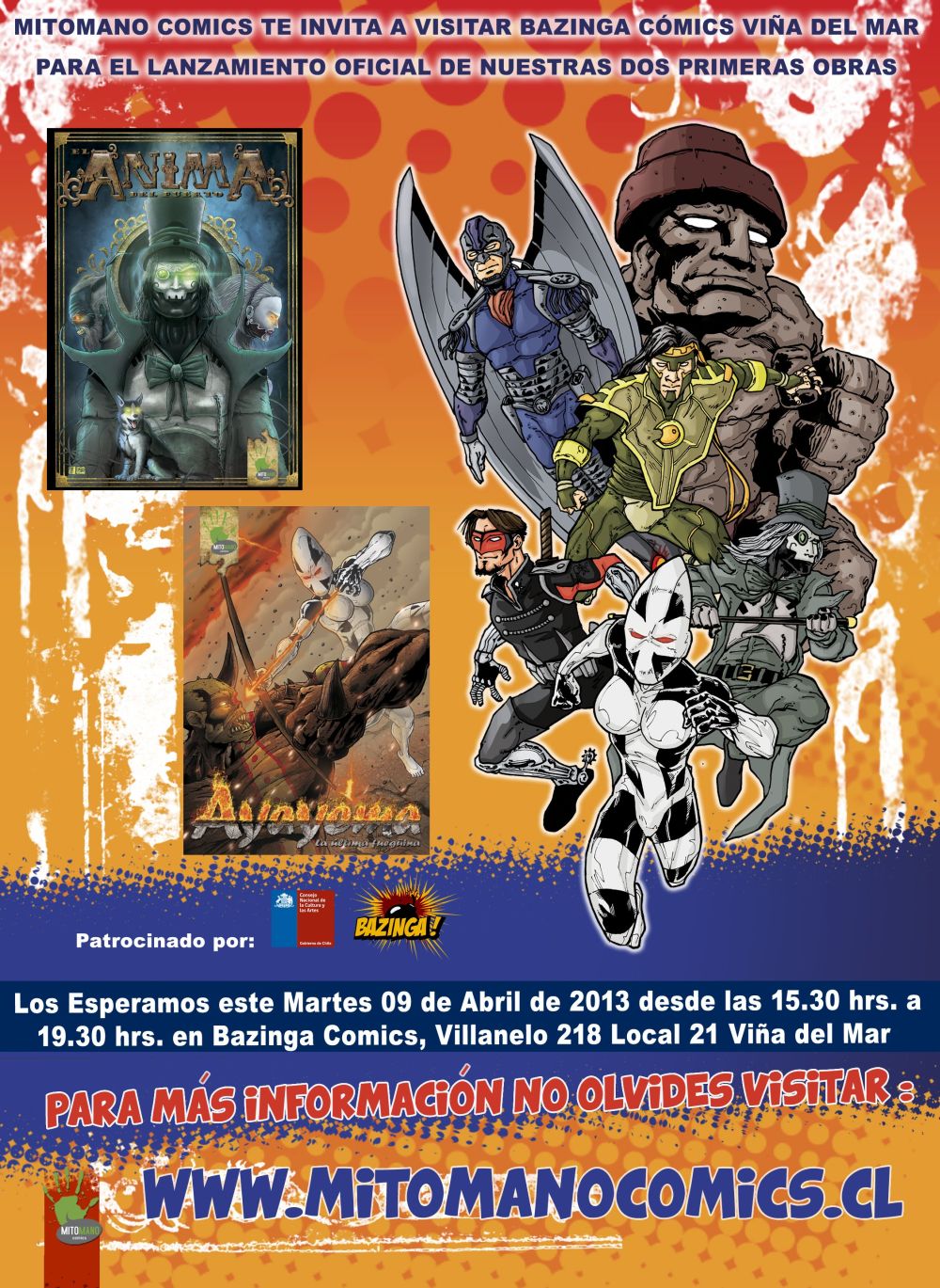 Tenemos el agrado de invitarlos al segundo lanzamiento de nuestras dos primeras obras impresas. Este lanzamiento lo haremos gracias al patrocinio de Bazinga Cómics de Viña del Mar, ubicado en Villanelo 218, Local 21, Viñar del Mar (en el segundo piso al lado del Supermercado Santa Isabel)